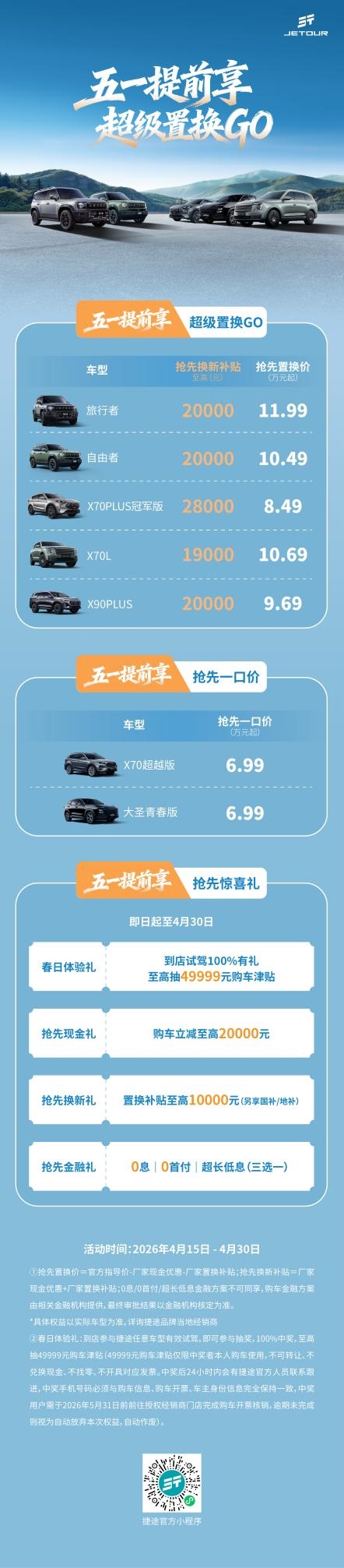五一假期来临之际,捷途汽车特别推出“五一提前享超级置换GO”系列购车优惠活动,即日起至4月30日,购车可享五一抢先置换价、至高49999元试驾购车津贴,并同步提供购车直降、置换补贴、0息/0首付/超长低息金融方案、整车终身质保及推荐购车权益,以全方位福利助力用户轻松升级出行工具。