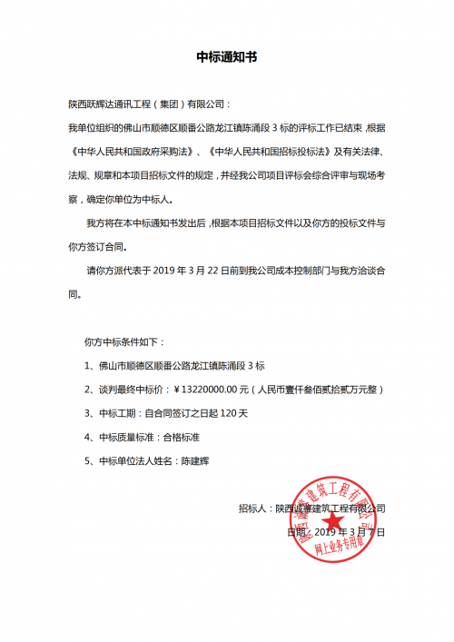 标题:陕西跃辉达中标“佛山市顺德区顺番公路龙江镇陈涌段3标”