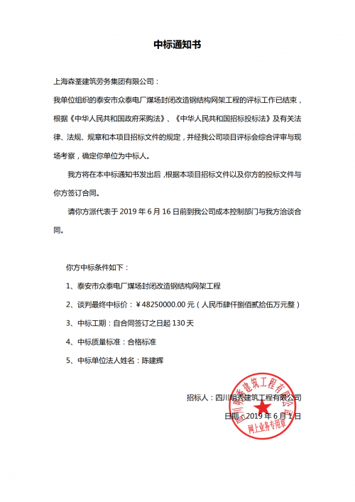 标题:上海森荃中标 “泰安市众泰电厂煤场封闭改造钢结构网架工程”