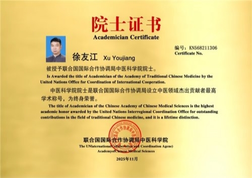世界智慧科学院在评语中指出,徐友江的研究 “ 打破了传统医学与现代科技的壁垒,为全球健康产业可持续发展提供了新范式 ”。这一评价高度概括了徐友江在中医领域的创新成就 。他的当选,让中医药在国际舞台上的地位得到了进 一步提升,为中医药国际化扫清了“ 理论壁垒 ” 与 “ 技术鸿沟 ” 。