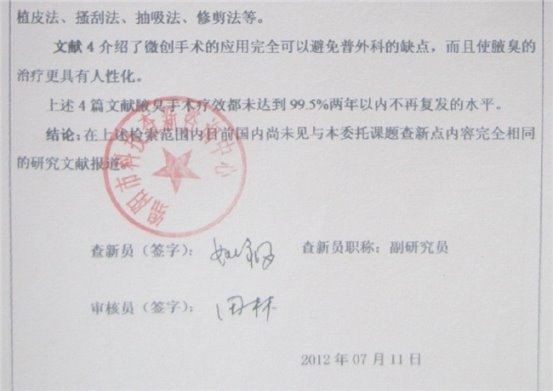 查新结论:委托查新课拟进行的小切口腋臭微创手术清除大汗腺并在术后对大汗腺远近心残端采用特定药物进行双向处理,使大汗腺残端闭塞而不能分泌脂肪酸的研究,国内外未查见有相同的研究文献报道。