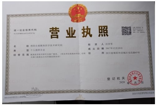 从2017年12月19日注册“绵阳众爱腋臭医学技术研究院”后于2018年元月10号辞去了成都中美皮肤研究院的工作,回绵阳从事腋臭根治工作。