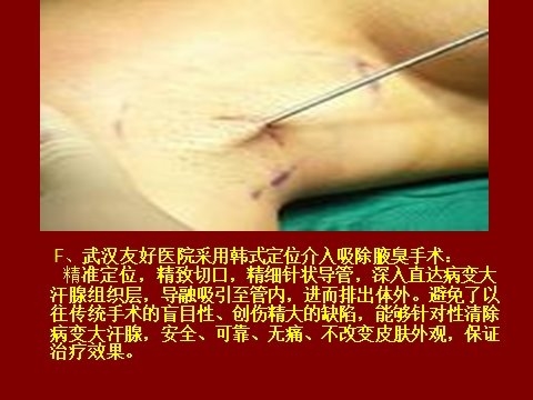 在腋窝中部,顺腋窝褶皱方向做一个与米粒大小的切口,通过内窥镜技术,进行可视化切除操作.再利用汗腺消融器,将腋毛部位的真皮层和皮下浅层的臭味源----大汗腺,逐一消融并彻底清除,达到彻底根除腋臭的目的。