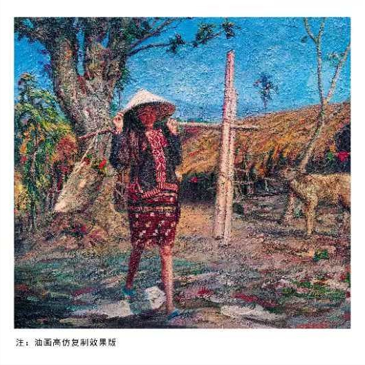在艺术创作表现手法上,王建顺在这幅《圆梦》作品上力求创新,独树一帜。他的笔锋笔触既粗犷凌厉又挥洒自如,对人物面容的描摹,他采用独创的生物肌理画法,使人物的表情与形态更逼真更富动感,对人物服饰造型及纹理的刻划,既细致又精准,显示了对材质质感把握的深刻理解和塑造能力。在前景与背景、近景与远景的关系处理上,王建顺借用了摄影蒙太奇的画法,让部分画面与场景产生相交与重叠的视觉,虚实相间,增强了画面的立体感、真实感,让人如亲临其境。在色彩的运用上,王建顺除了一贯使用的独创激活法,让画面颜色更分明更具层次感之外,特意增加大面积的金黄颜色,使作品更具朦胧感、梦幻感;背景那一大片天空亮色,与海水相近,不仅丰富了画面的观感,冷暖搭配,也隐喻了海水稻培育成功与光明的发展前景;而袁隆平身后的这颗长满稻穗的千年古树(画家取名“仙禾树”),和黎族小女孩身旁的宠物狗身上系的吉祥绳,这是有意添加了吉祥的元素,让整幅画透着一股仙气,更凸显了“梦”的主题。用颜色来调剂和幻化,进一步丰富画面语言,这正是画家的高明之处,更让人不由自主地张开梦想的翅膀,引发无限遐思......