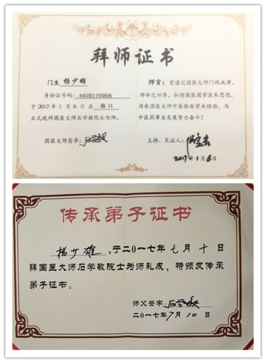 杨少雄,1958年生,广东省汕尾市人,大学学历,深圳市罗湖区杨少雄中医诊所负责人,中医注册执业医师,中医特色疗法专家,国际注册中医副主任医师(可国外行医),为广东省私家医师学术研究会常务副会长。先后师从国医大师国内著名针灸大师石学敏院士、国医大师李佃贵、国医名师四川省名中医蔡氏脏腑经络微循环整体疗法创始人蔡昌晋教授、四川省治癌名中医李姝糖。被《华夏瑰宝-国医名师经验录》编委会授予“国医名师”称号。学习、进修和毕业院校:汕头市人民医院、广州中医学院、湖北中医学院。学医行医从事中医事业连续五十余年。