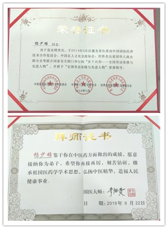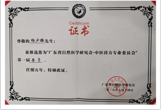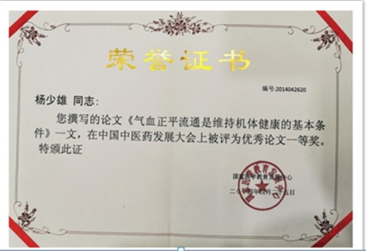 2014年4月杨少雄教授撰写的《气血正平流通是维持机体健康的基本条件》论文在中国中医药发展大会上被评为优秀论文一等奖。